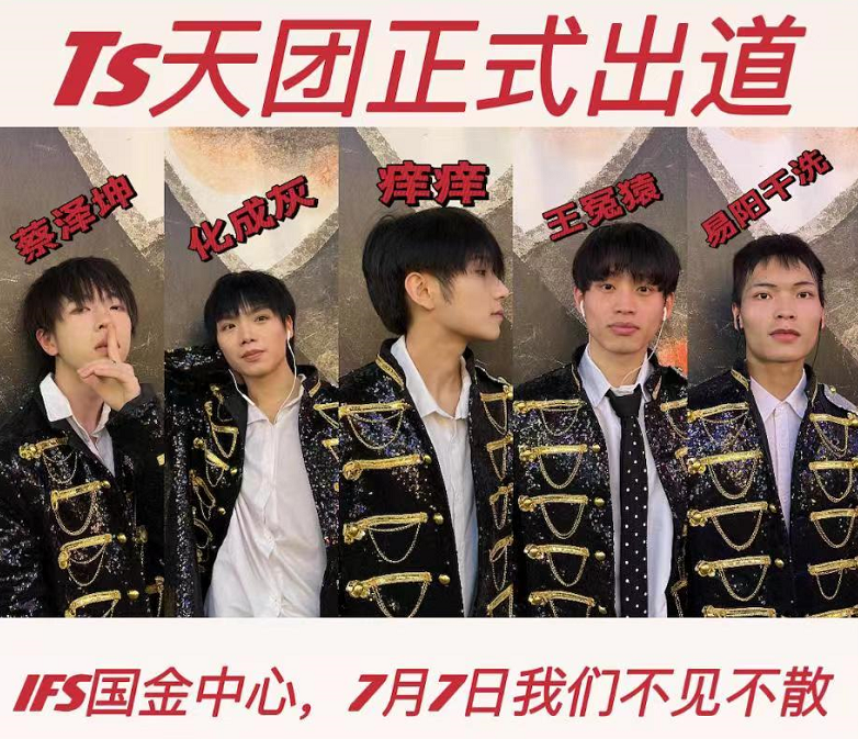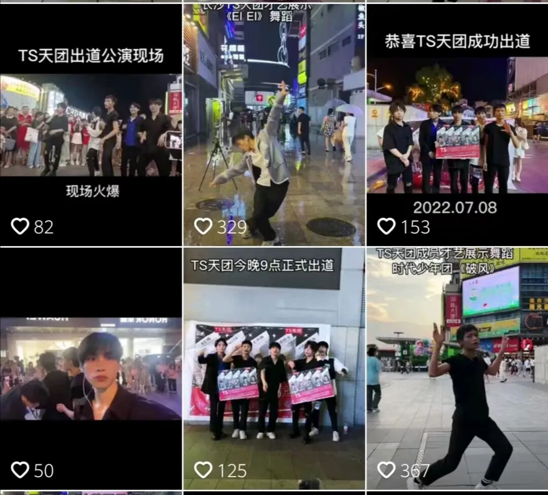 选择成团的原因只有一个,“就想蹭一波热度”,蔡泽坤说。和ESO一样,在五一广场、黄兴路,在长沙人流最密集的几条街上,TS男团顶着山寨的名号,跳着内娱偶像男团的舞蹈——《EI EI》、《破风》。这种“硬蹭”确实给他们带来了一定流量,易烊干洗回忆,直播间最多时有将近7千人在线。