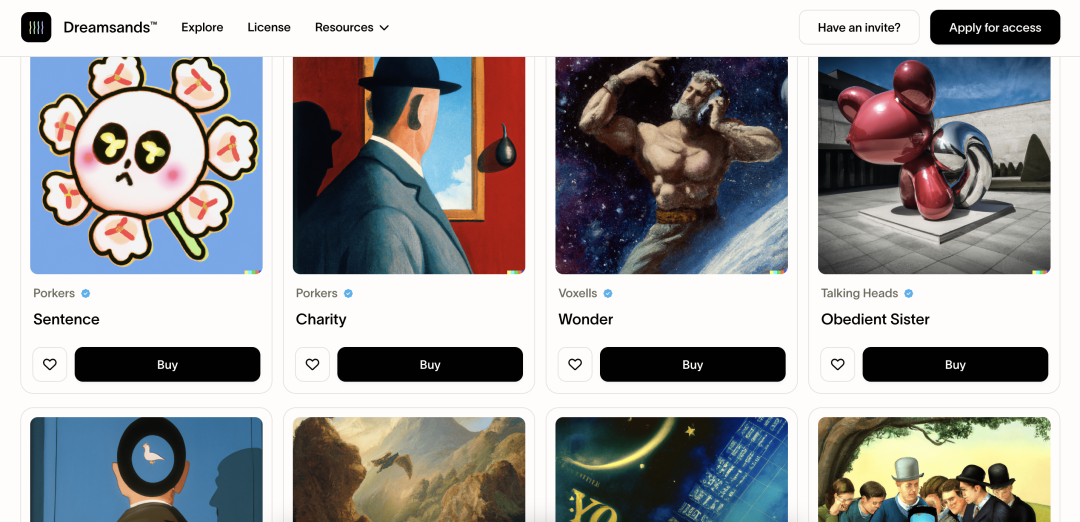 AI生成在社交媒体上的泛滥讨论一直带有科学伦理方面的色彩和偏见,而关于图像生成技术的讨论则始终由艺术爱好者、设计师、艺术家这类人群在推动,因此,AI Art所带来的关于艺术设计生产效率、知识产权、图像数据复用等方面的延展和保护性服务可能会是下一个市场风向。另外值得一提的事,近期在全球最大的产品社区Product Hunt上,已经出现了针对AI Art的艺术作品交易市场。这可能是自NFT流行以来又一个新兴的垂类版权交易赛道。