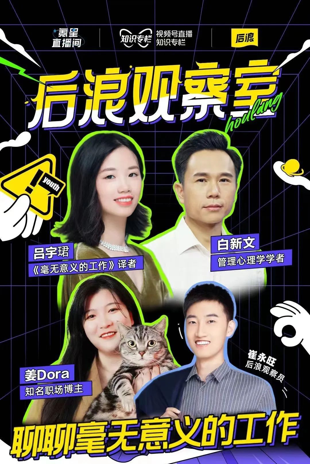 这一次,「后浪研究所」的直播栏目「后浪观察室」邀请到中国科学院心理研究所副研究员白新文、《毫无意义的工作》译者吕宇珺、知名职场博主姜Dora,一起聊聊「毫无意义的工作」。