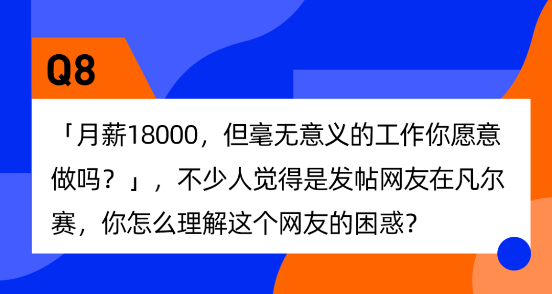 白新文:这个网友的提问我觉得是真诚的,因为我见过很多高学历、高收入的人有类似困惑。评论区的留言情况,我觉得可能反映了一个普遍的认知,就是我们高估了收入对一个人工作意义的重要性。