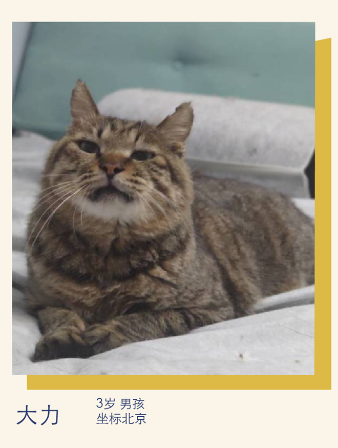 其他信息:大力是小区住户搬家疑弃在小区的猫咪,它性格好不怕人特别亲人,每天都有邻居喂它。但是22年夏天它被坏人拿棍子打的下颚骨断裂,牙齿都打掉好几颗。第二天发现它的时候真的太惨了。我们带它去医院紧急治病,做了手术给下颚骨打了钢钉。大力真是命大,活下来了,经过半年的调养它已经完全恢复了。大力非常亲人,被人伤害过也依然很信任人,太心疼它了,希望有爱心家庭能收养它,给它一个安稳的家,不离不弃,谢谢。领养要求:本地领养;有稳定居所和收入;接受签订领养协议;留身份证照片;打卡回访;科学喂养猫咪、按时免疫驱虫。联系方式:林七 754673671(微信备注:宠安家*36氪领养活动)