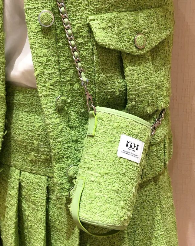 草绿色粗花呢套装的颜色远远看着很清新,嫩嫩的青草色,一上身就好夏天,还特别显白。