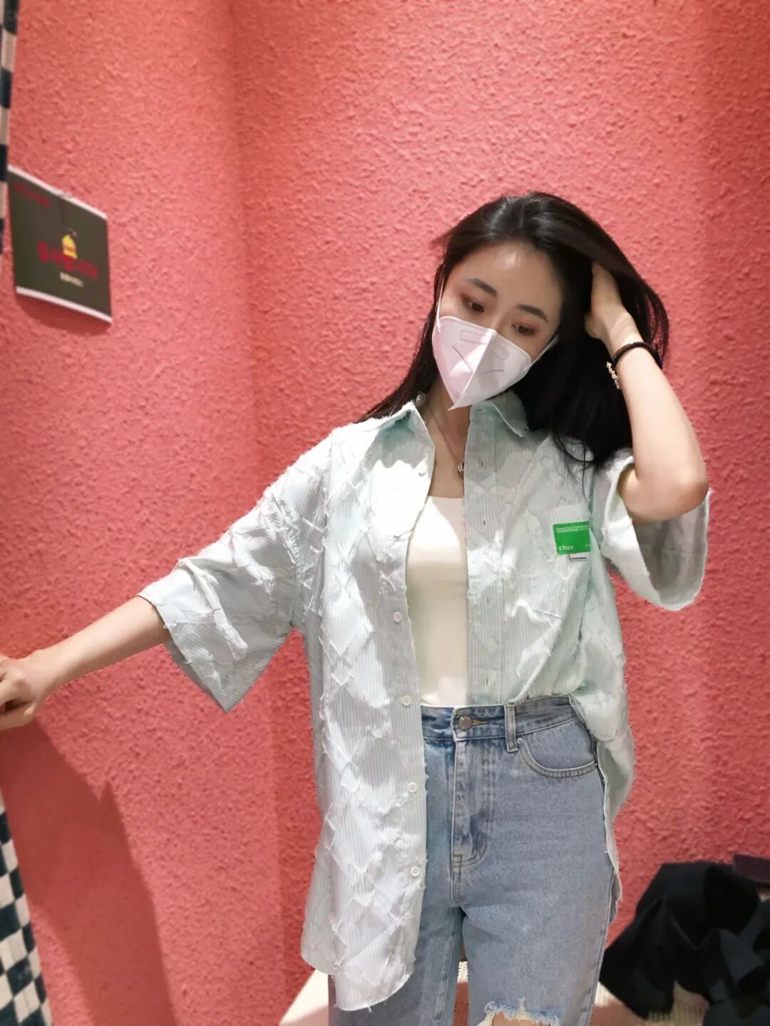 # 浅薄荷绿衬衫+牛仔短裤