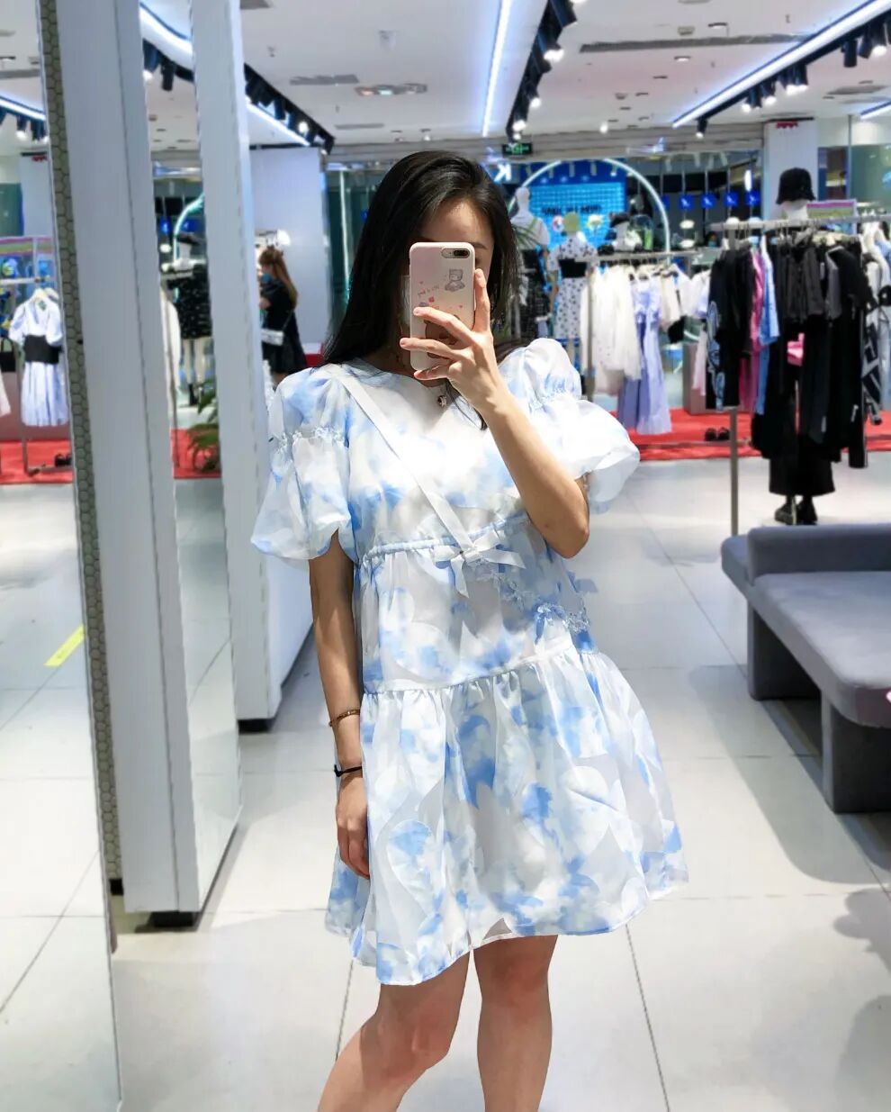 蓝白色晕染和隐约的花朵很像蓝天白云有木有,领口还有透明花朵链饰点缀,生动俏皮。