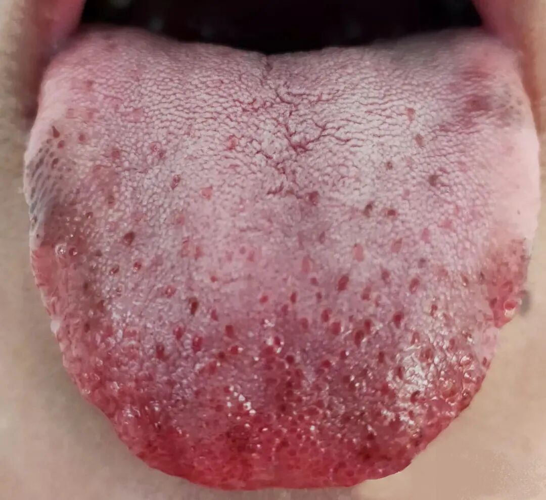 除了瘀斑和裂纹,她还有明显的舌尖红,上面有肉眼可见的小红点—— 说明她心火也很旺,思虑很重。