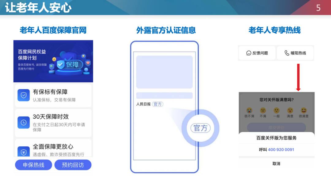 同时,还将推动APP适老化通用设计规范升级为国家标准、推进互联网应用无障碍设计纳入无障碍环境立法等工作。随后,信息无障碍研究会专家委员会无障碍专家陈澜介绍了她对于《障碍用户视角下的产品思维》的思考:随着老年用户的认知及社会发展变化,他们使用互联网产品的痛点主要为信息获取障碍、操作障碍、界面理解障碍三个方向,如何解决这些障碍是互联网产品适老化的核心难题。“信息无障碍是一项系统工程,任何障碍场景下的无障碍问题,都不仅仅是一款产品能够解决的,需要从法律、标准、技术方面着力,也需要从观念、意识等方面着眼,更需要各互联网企业发挥腰部作用,通力合作解决无障碍问题。”接下来,百度关怀版产品负责人夏炜以百度关怀版为例,向大家分享了百度的适老化产品思路:在充分地进行老年群体需求调研及众测之后,从老年用户内在需求出发,结合百度App核心的功能,从情感层面打造核心体验。不仅要易阅读、易收听、易操作、易理解,还要通过视频自动连播、偏好内容推荐优化、使用教学视频等细节设置上,提升老年群体的体验感受。除此之外,还通过建立老年人百度保障官网、外露官方认证信息、提供老年人专享热线等让老年群体使用产品更加有安全保障、更加有陪伴感。