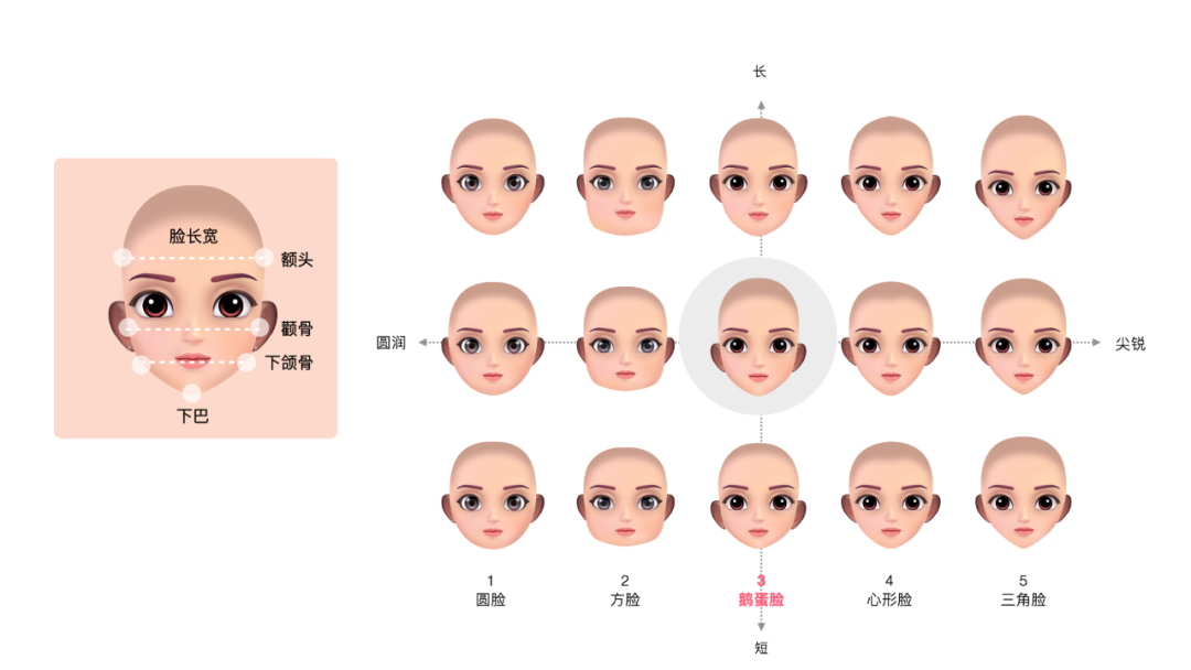 第二步,五官的起点是脸型,选择曲直适中,长短适中的鹅蛋脸(额头与颧骨等距),不挑发型。