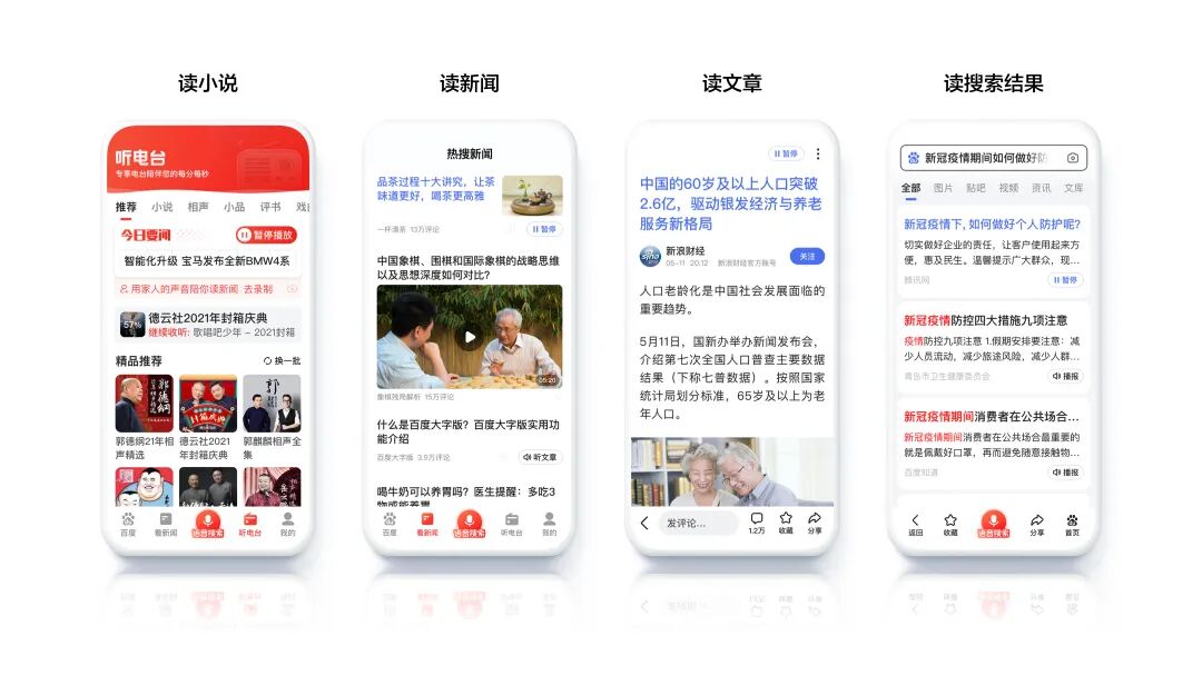由于很多年轻人去大城市寻找机会,导致产生很多空巢老人,他们情感孤独,缺少陪伴。疫情的爆发,更使老年人在节假日也难以与家人团聚。因此百度大字版通过语音合成等AI能力,还原儿孙亲友的真实声音,用于全局内容播报朗读,使老年人感受到至亲至爱仿佛陪伴在他们身边,缓解老年人的孤单和思念之情。全局语音朗读也能解决老年人的阅读障碍和长时间阅读导致的视觉疲劳问题,同时可以解放双手,使老年人随时随地听朗读。