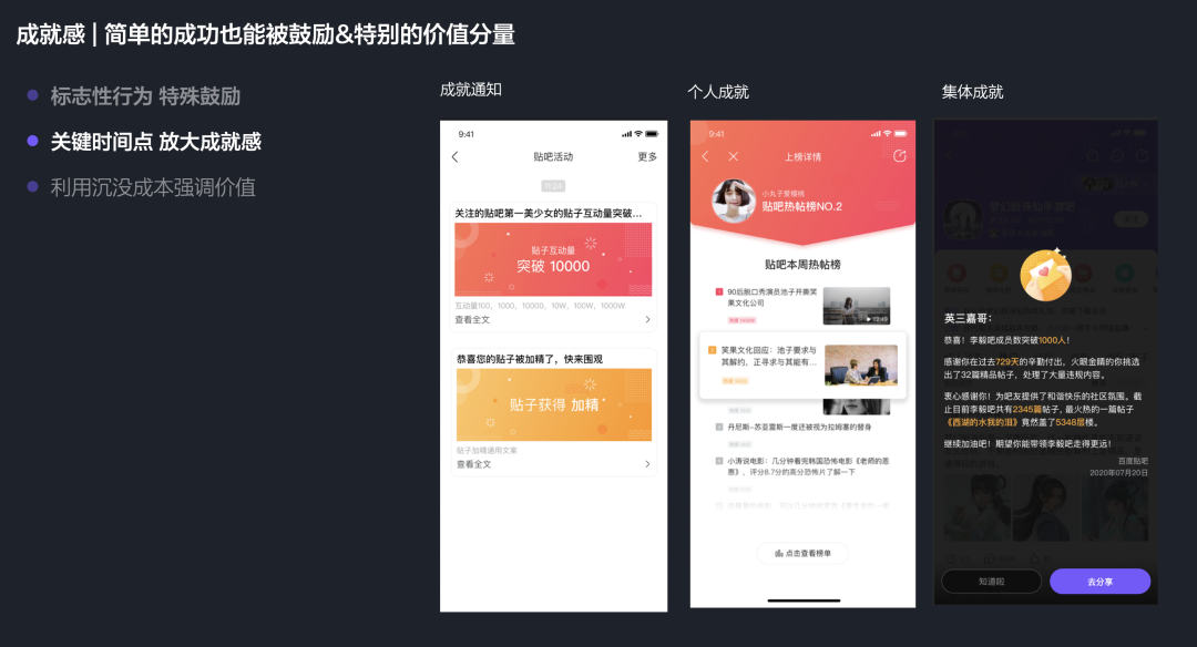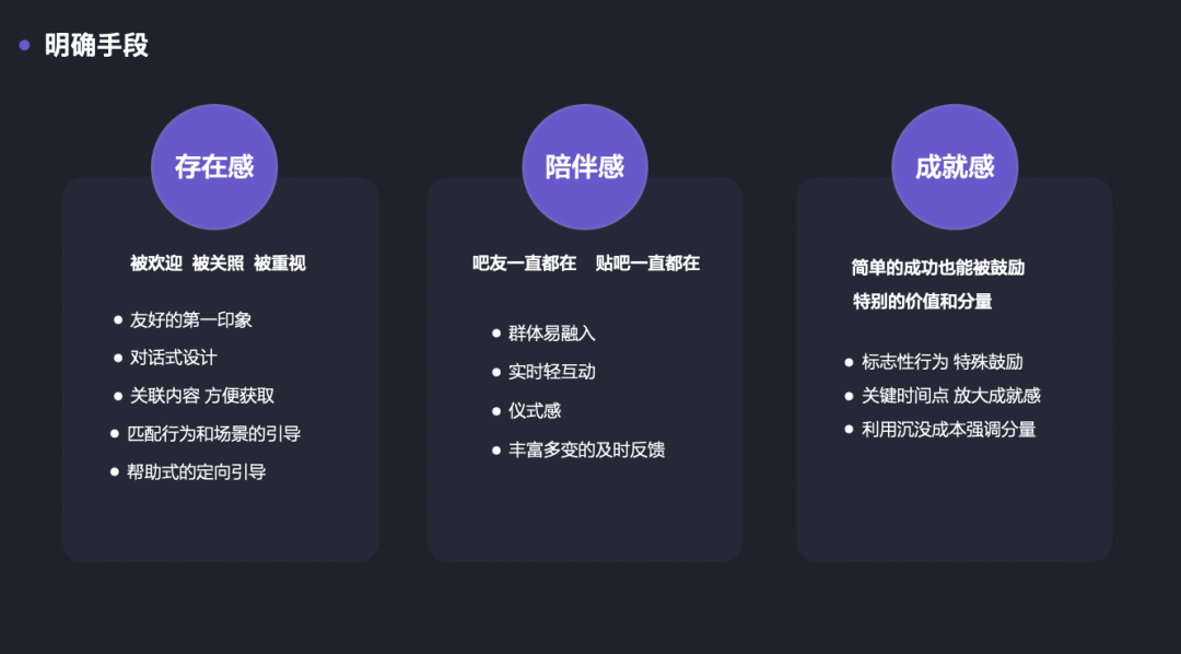 对贴吧而言,最终提炼出存在感、陪伴感、成就感3个关键词,并明确了每个关键词的定义及设计策略。