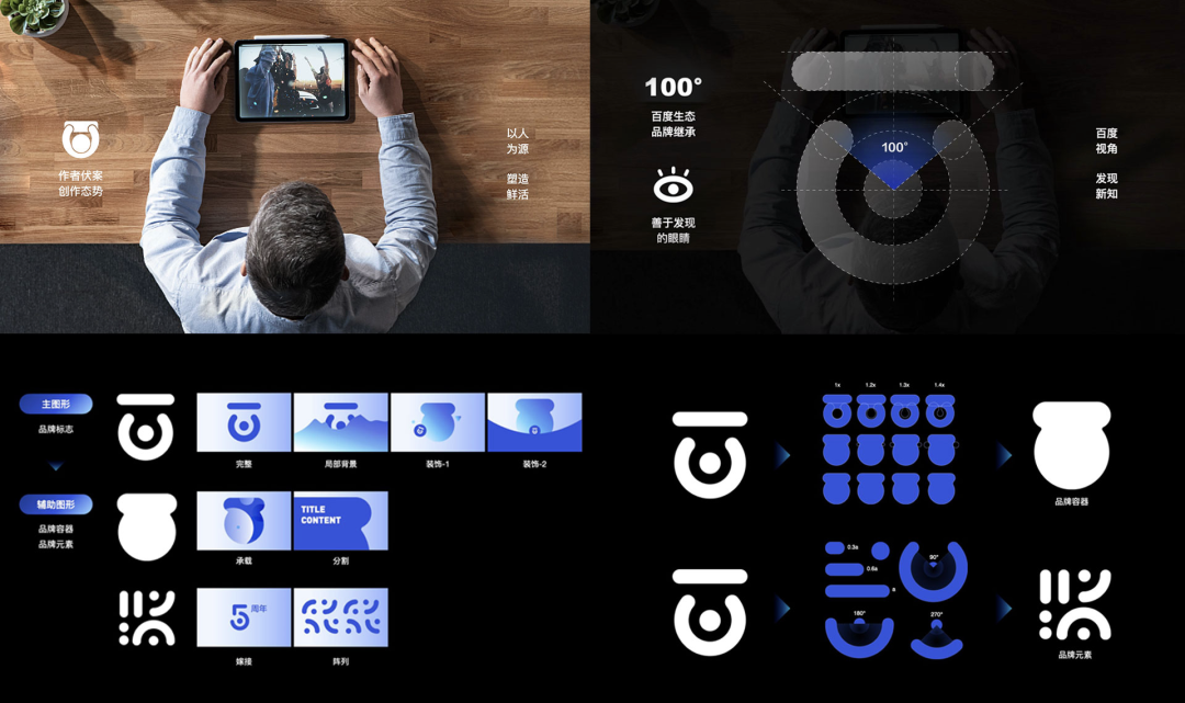 技术日新月异,创作形态在不断发生变化,而不变的是创作的源点。我们将作者伏案创作的态势凝炼成「百」字图形作为百家号的品牌标志,以人为源塑造鲜活的造型,更加简约圆润,更易识别也更具包容性。图形开口角度为100度,继承了百度生态的品牌印记,同时也组成了善于发现的眼睛,传递了品牌「百度视角 发现新知」的价值观引导。为了进一步拓展品牌的继承性,我们由品牌标志延伸出了品牌辅助图形,「标志廓形的品牌容器」 和 「标志拆解的品牌元素」。同时界定了他们的使用规则和应用范围,确保在品牌传播的每一个环节都得到最优的展现。![]()