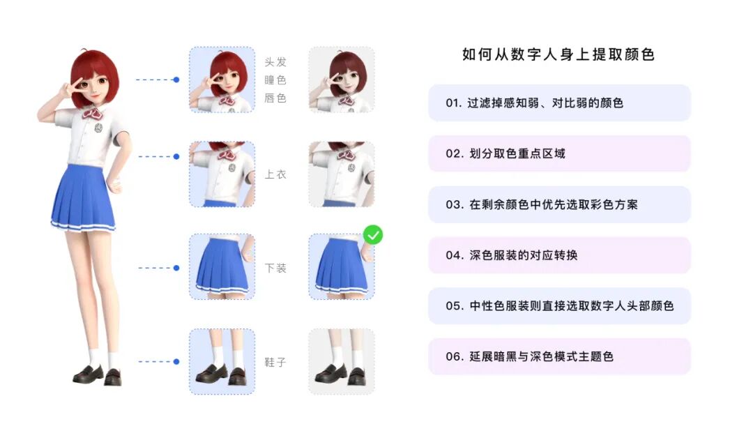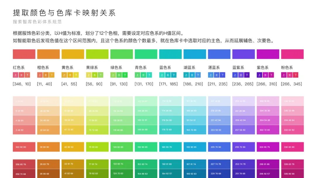 通过对数字人装扮的色彩分类,我们以H值为标准,通过调整S值与B值,划分了12个色相,设定对应色系的H值区间范围,如智能取色色值在该色相区间范围内,且吸取到的候选色个数最多,就在对应的色库卡中选取主体色。