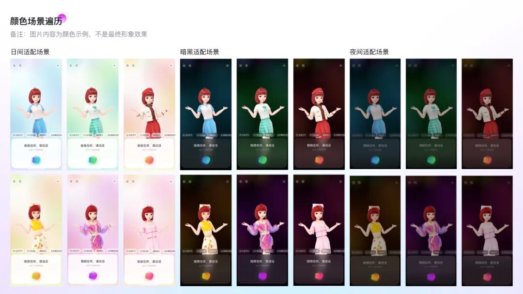 考虑到语音搜索场景日后的拓展,色彩上希望可以营造给用户一种轻松柔和的视觉氛围,并且元素的色彩需要与AI伙伴服饰相呼应,从而使AI伙伴形象更加灵动、场景搭配更加和谐生动。