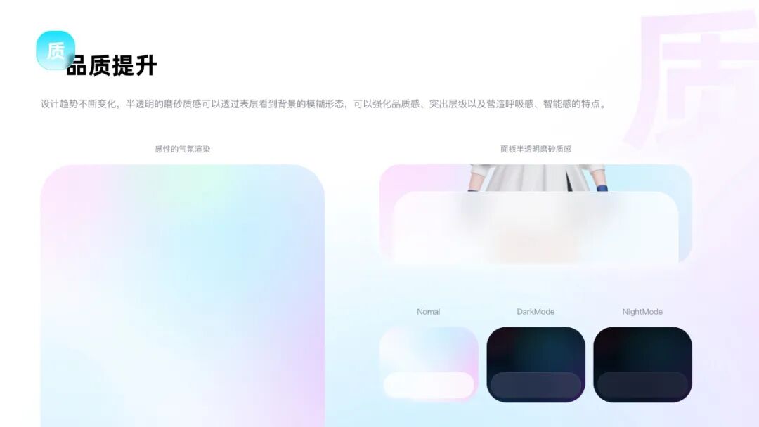 质感:设计趋势不断变化,半透明磨砂质感是近期流行的视觉风格,透过表层可看到背景模糊形态,有强化品质感、突出层级以及营销氛围感的特点,同时匹配视觉方向「轻盈」的特征。
