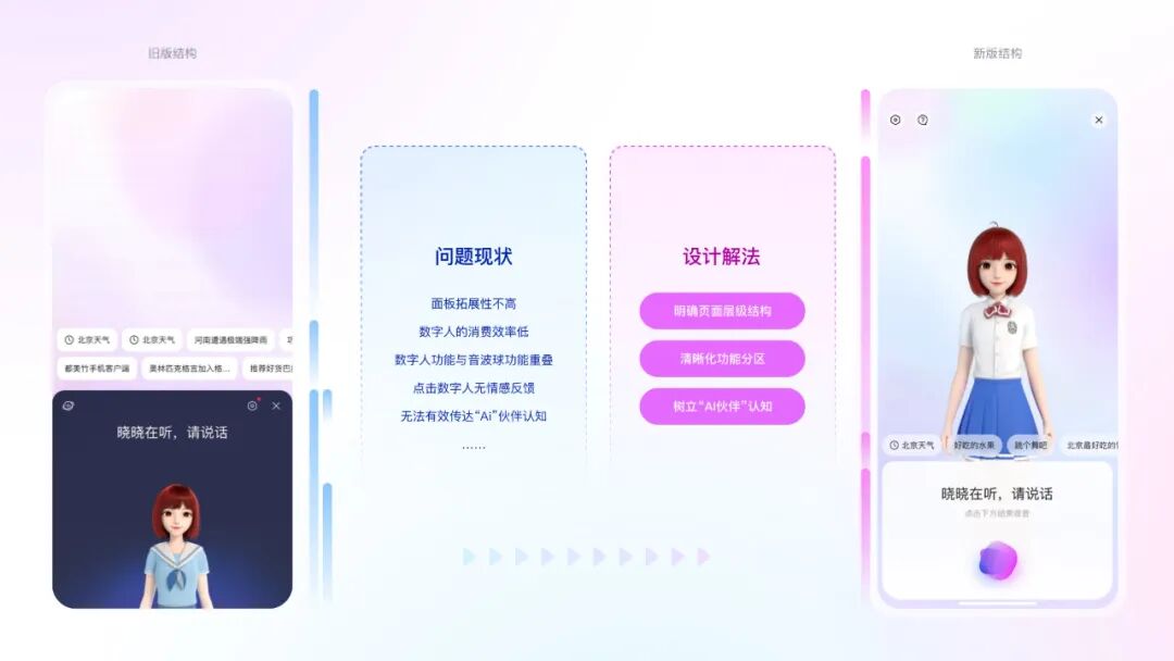在旧页面中,语音面板限制了人物与按钮的展现,人物既要承载功能反馈又需要作为物理操作按键进行点击操作,与用户认知相悖且也不利于功能扩展。因此在新版本设计中,需要明确“人”在语音搜索里的属性,以及AI伙伴与语音搜索的关系。