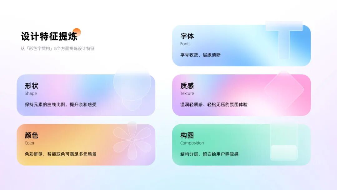基于视觉方向及特征提炼,在质感、形状、颜色三个设计中改动最大的方向详细描述。