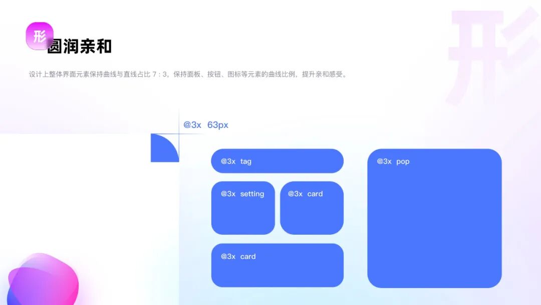 形状:在形状的设计上,整体界面元素保持大量带有弧度的形状运用,提高面板、按钮、图标、弹窗等元素的曲线比例,让界面始终保持年轻态,给人圆润、亲和的感受。
