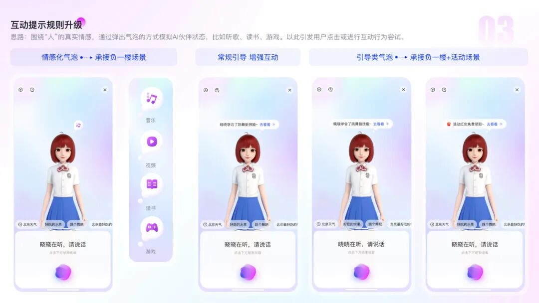 2)互动提示规则升级:围绕“人”的真实情感,通过弹出气泡的方式模拟AI伙伴状态,比如听歌、读书、游戏。以此引发用户点击或进行互动行为尝试。并且配合AI伙伴升级引导规则,使引导能够根据不同场景进行适配,保证其既可以承接语音常规引导功能,又可以承接负一楼聊天互动,点击气泡可跳转对应负一楼场景、联动数字人语境内容,避免造成场景情感化割裂。