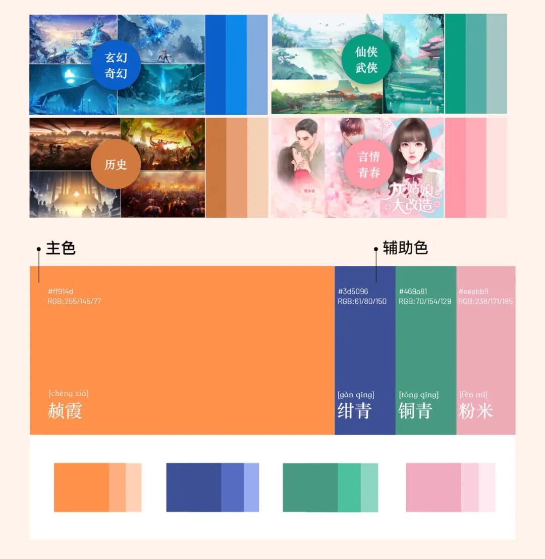 以书香气为理念,受到中国纸质文学的启发,探索如何将“书”的质感和“看书”的沉浸用视觉语言表达出来。在定义颜色时,基于产品品牌色,尝试以中国传统颜色进行多种配色尝试,并结合小说分类内容拆解色彩体系。
