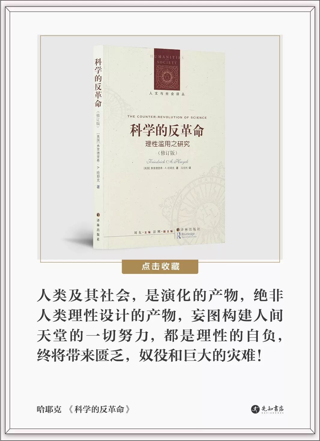 哈耶克在《科学的反革命:理性滥用研究》中预言:“人类天然具有崇尚理性和乌托邦的冲动,随着未来科技的高速进步,一代又一代的人,会将‘致命的自负’运用于人类经济社会本身的组织设计中去,人类可能将永远无法摆脱乌托邦对个人自由的诅咒!”