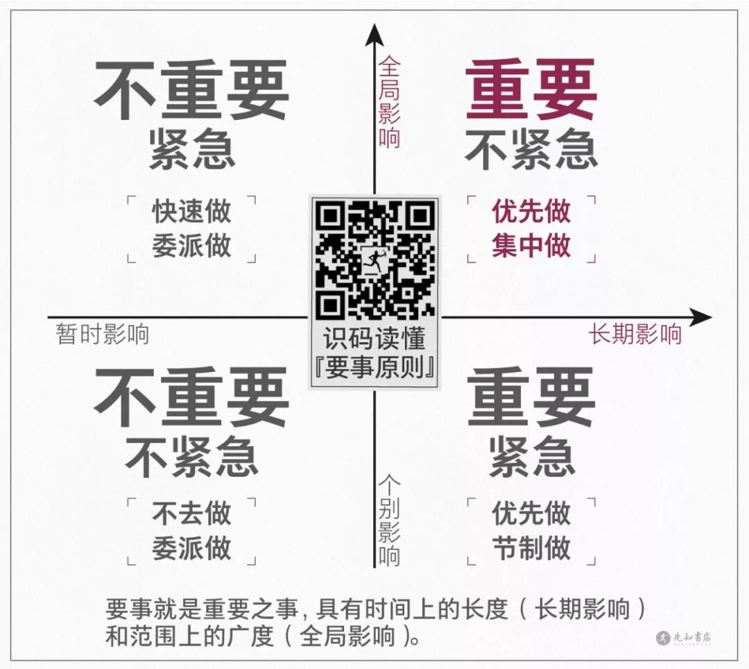 卓有成效的管理,就是更充分地展示人性,更有效地创造人与社会的价值。管理是人的“延长的手”,所以,每个人都是自己的管理者。“选择困难症”让我们很难判断到底哪件事情更重要,就像法国哲学家布里丹笔下的驴子一样,在不同的草料中犹豫不决,踌躇难行,最后只能饿死。而“拖延症”则是我们明明知道一件事情很重要,但就是不去做。尤其对于一些比较困难的事,容易产生畏难心理,越恐惧就越拖延,最后一事无成。于是,有人想出了一个很聪明的办法:将每天需要做的事情列一个清单,并按照紧急和难易程度,排列优先顺序,然后一一完成。这种被称作“清单革命”的方法,看似同时治愈了两大顽疾,然而,很多“清单控”到最后发现:躺在清单上的待办事项越来越多,而身心俱疲到不得不放弃。正如“现代管理学之父”彼得·德鲁克所指出的:事事都办,却浅尝辄止,很容易,也能皆大欢喜,结果却是一事无成。是“清单革命”错了吗?不是。清单革命只是第一步,重点在后面。德鲁克说:“如果卓有成效的管理有唯一秘诀,那就是‘聚焦’,聚焦要事,且每次只做好一件事。”乍一听这是一句正确的废话,“专注完成重要的事”——这是多么简单的道理啊。如果你也这样以为,不妨先做一道选择题(不要偷看答案哦):