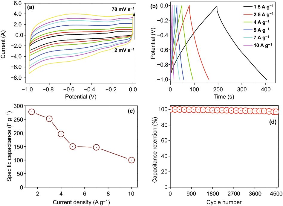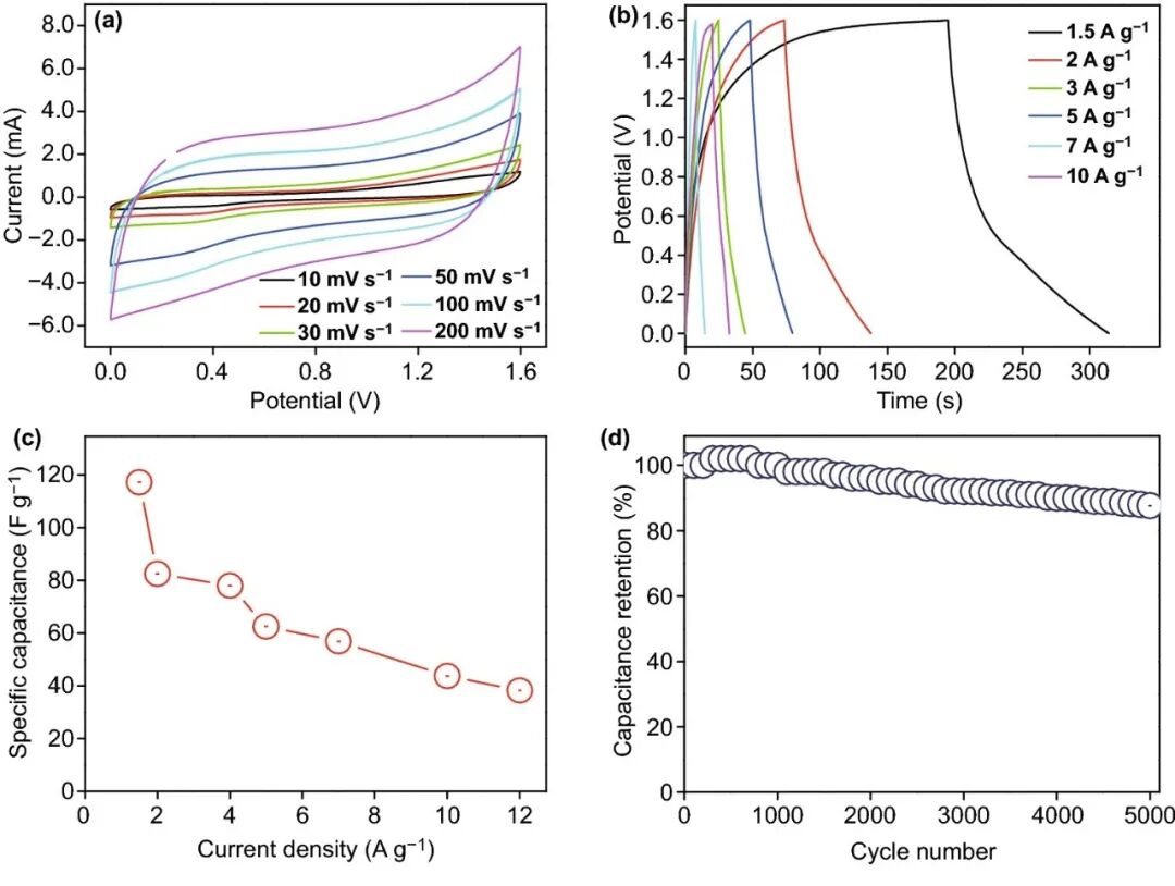 图10 (a) CV曲线, (b) 恒电流充电/放电曲线, (c) 比电容, (d) 循环稳定性测试。