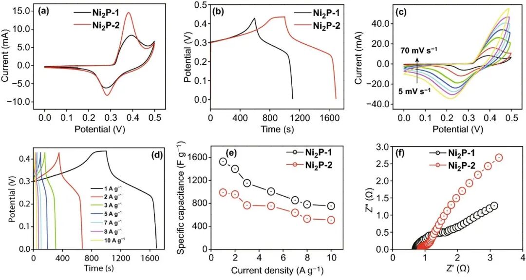 图9 (a) Ni2P-1和Ni2P-2的CV曲线比较图, (b) Ni2P-1和Ni2P-2 GCD曲线(c) Ni2P-2在不同的扫描速率下 CV曲线, (d) Ni2P-2在不同电流密度下的GCD曲线, (e) 计算的Ni2P-1和Ni2P-2比电容, (f) Ni2P-1和Ni2P-2的交流阻抗谱。![]()