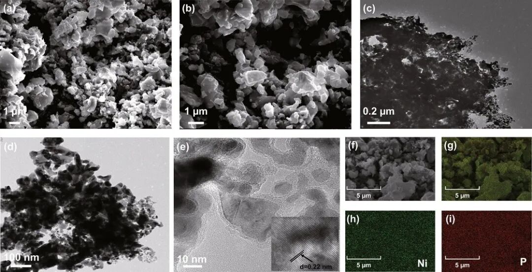 图8 Ni2P SEM, TEM和HRTEM图像,以及相应的Ni2P-2元素分布。