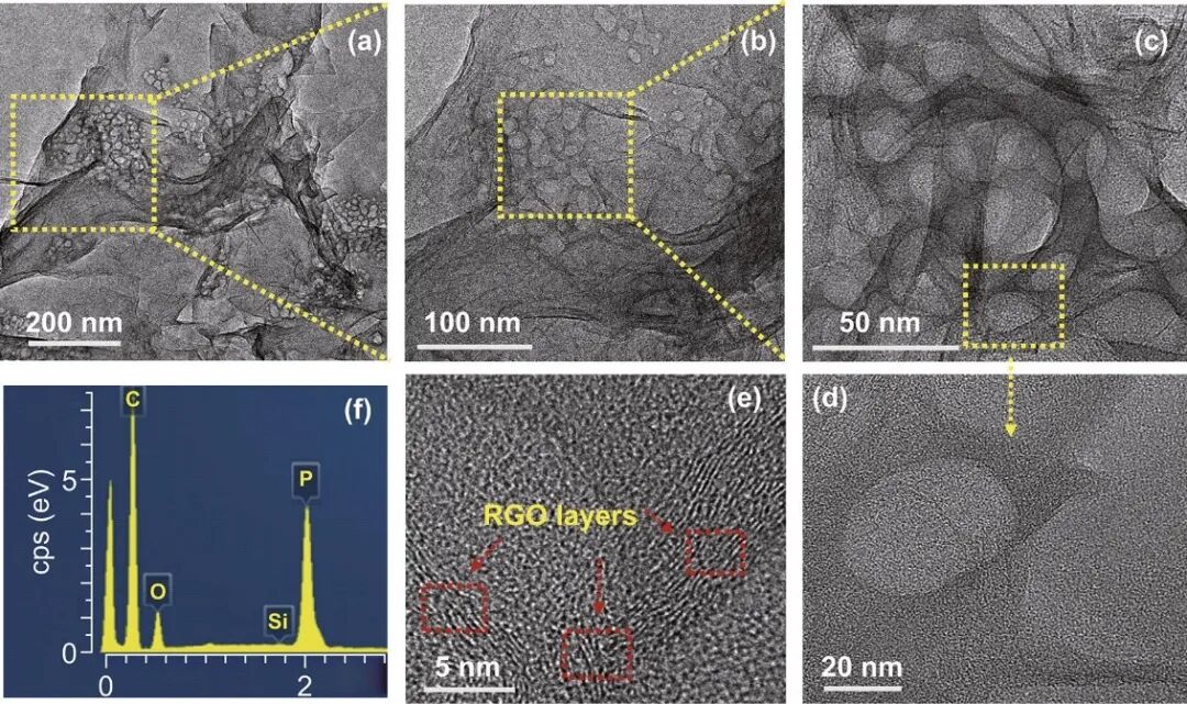 图3 (a-e) rP@rGO的TEM和HRTEM图, (f) 相应的rP@rGO的EDX图。