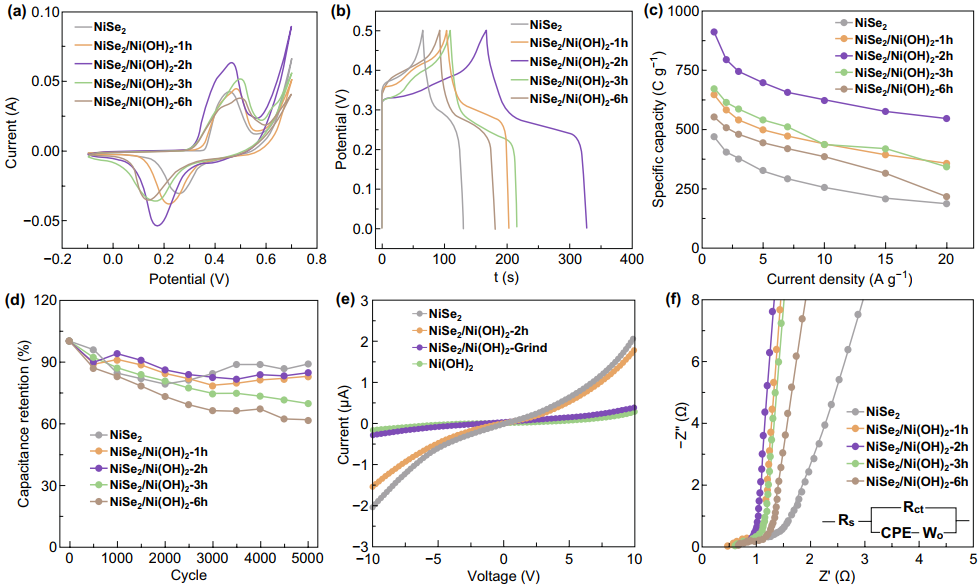 NiSe2/Ni(OH)2显示出了优异的电化学性能,其比容量达到909 C/g (1 A/g)。特别是其倍率性能,20 A/g时仍然有597 C/g。其优异性能主要源于以下几点:(1)Ni(OH)2的孔道结构利于电解质离子的快速迁移;(2)NiSe2八面体的良好导电性促进了电子传输,其机械强度赋予了材料良好的循环稳定性;(3)NiSe2/Ni(OH)2的异质结提供了高电化学活性的Ni(OH)2与高导电性的NiSe2间的快速电子传输通道。