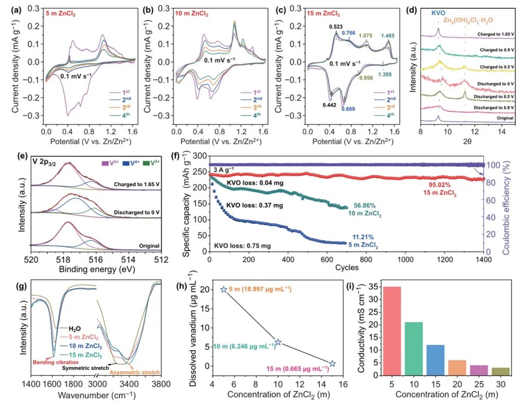 图2. (a-c) Zn//K₀.₄₈₆V₂O₅电池分别在5 m,10 m和15 m ZnCl₂电解液中的CV曲线,(d) K₀.₄₈₆V₂O₅不同状态下非原位的XRD图,(e) K₀.₄₈₆V₂O₅不同状态下非原位的XPS图,(f) Zn//K₀.₄₈₆V₂O₅电池在不同浓度ZnCl₂电解液浓度中的循环图,(g) 不同浓度ZnCl₂电解液的红外光谱,(h) Zn//K₀.₄₈₆V₂O₅电池在不同浓度ZnCl₂电解液中循环后钒的ICP图,(i) 不同浓度ZnCl₂电解液的离子电导率。