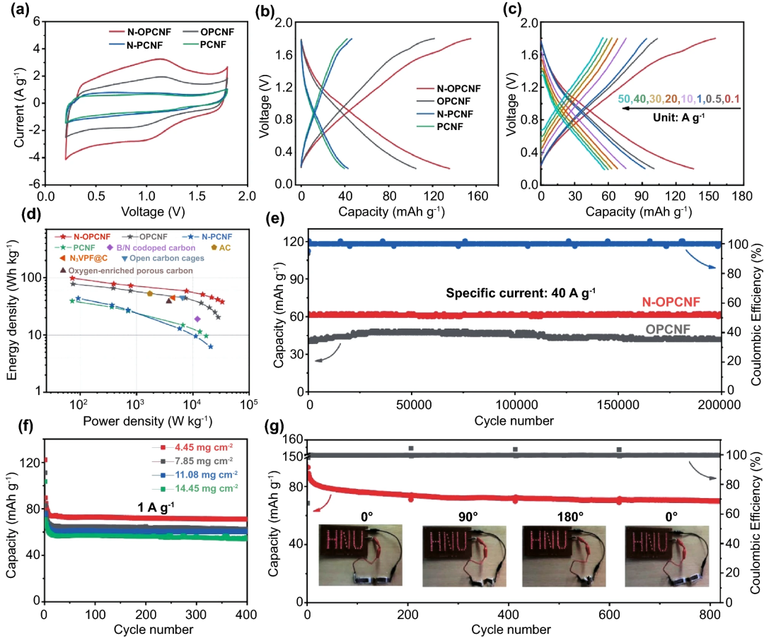 为了解决碳纳米纤维薄膜活性吸附位点少的问题,湖南大学张明教授课题组通过在碳纳米纤维上原位剥离出高吡啶/吡咯氮掺杂和羰基官能化纳米片,成功将多重化学吸附位点修饰到了碳纳米纤维表面。所获得的柔性自支撑N-OPCNF正极具有比表面积大、亲水性强、Zn²⁺吸附活性位点多且吸附活性强等优点。非原位表征分析和DFT计算的结果表明,在放电过程中羰基和吡啶/吡咯氮原子都可以作为Zn²⁺宿主,而高负电性的吡啶/吡咯氮原子还可以作为强电子受体诱导羰基电荷离域,从而提高羰基对Zn²⁺的吸附活性。因此,具有多重化学吸附位点的N-OPCNF正极表现出极高的能量/功率密度(98.28 Wh kg⁻¹和33.2 kW kg⁻¹)和超长期循环稳定性(在40 A g−1的电流密度下200000次循环后的容量保持率为99.2 %)。特别是,即使在14.45 mg cm⁻²的超高负载量下,N-OPCNF正极仍具有高电容保持率(保持初始值的66.3 %)。该项工作提出的表面工程策略有效解决了碳基ZIHCs缺乏活性Zn²⁺吸附位点的瓶颈问题,这一策略还可以推广到其他高性能储能器件的开发中。