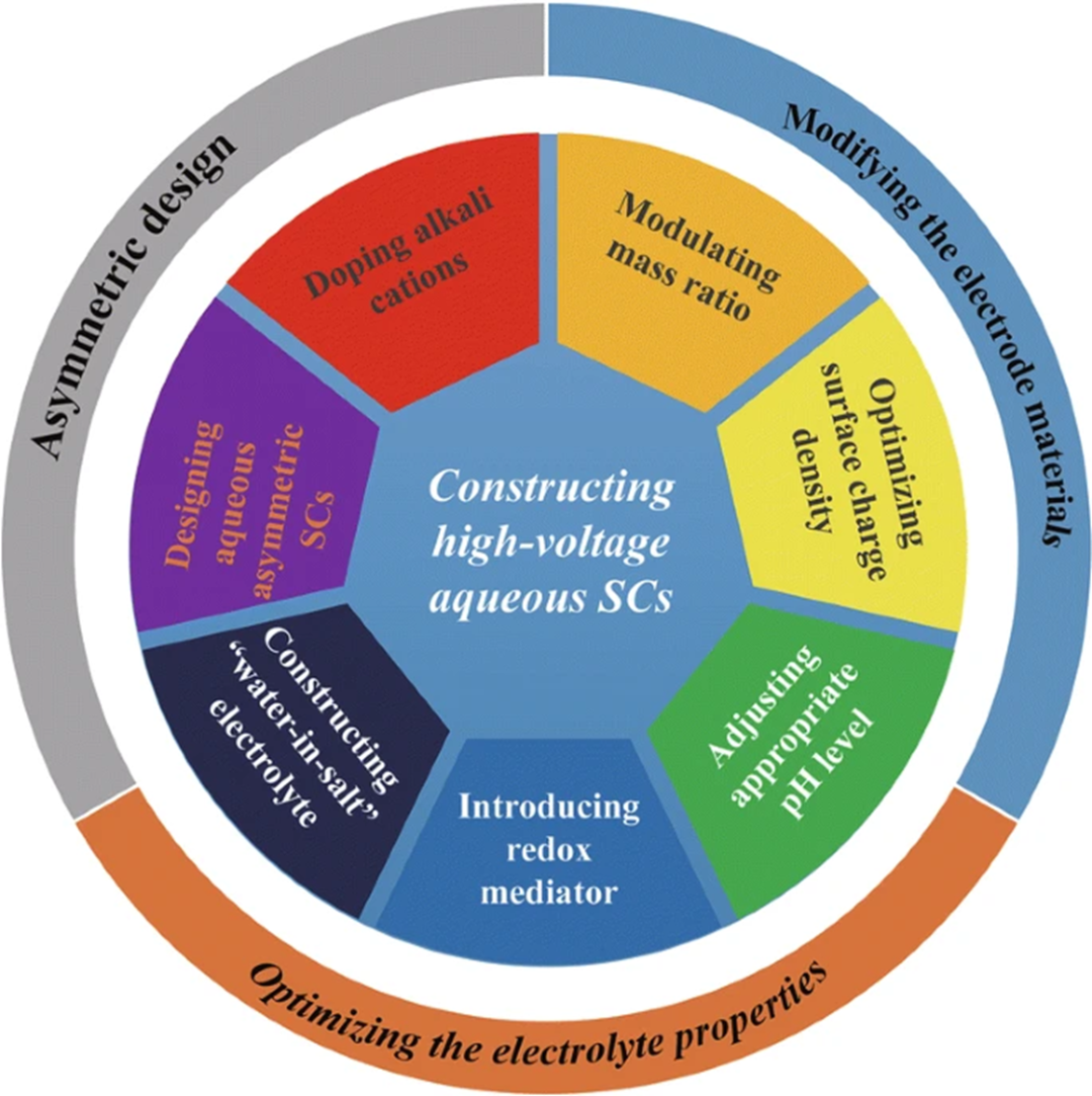 近年来,化石能源的大量燃烧所引起的环境问题,给人类的生存和发展带来了巨大挑战。因此,寻找清洁和可持续能源的高效储能设备已成为重要的课题之一。由于其快速充放电、高功率密度、低成本和出色的循环稳定性,超级电容器被认为是合适的下一代储能设备。受制于水系电解质的分解和不合理的电压范围,水系超级电容器的电池电压范围比较有限,进而导致器件能量密度低。目前商用超级电容器主要基于碳材料,通过电极表面对电荷或电解质离子的物理吸附/解吸来存储/释放电荷。与商业电池(>100 Wh kg-1)相比,电化学双层电容器(EDLCs)的能量密度(低于10 Wh kg-1)仍然很低,这成为超级电容器大规模应用的巨大挑战。为了解决这个问题,开发具有更高比电容的电极材料和提高材料的电压窗口是极为迫切的。此外,对于结构设计策略、高功率/能量密度和快速赝电容反应动力学之间的关系的系统讨论也十分重要。