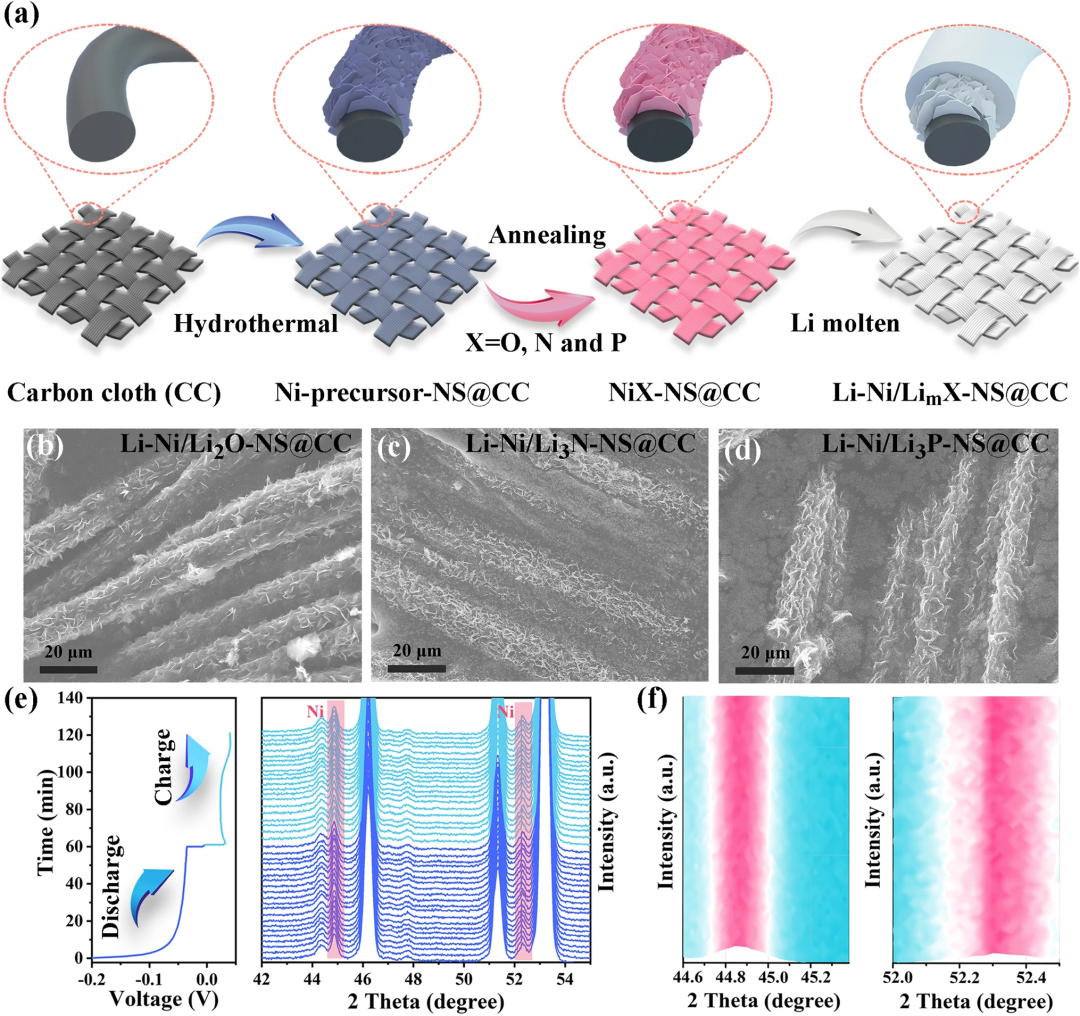 图2. (a) Li-Ni/LiₘX-NS@CC电极的制备流程示意图;(b-d) Li-Ni/Li₂O-NS@CC,Li-Ni/Li₃N-NS@CC和Li-Ni/Li₃P-NS@CC电极的SEM图像;(e, f) 在放电和充电过程中Li-Ni/Li₃N-NS@CC电极的原位XRD图谱。