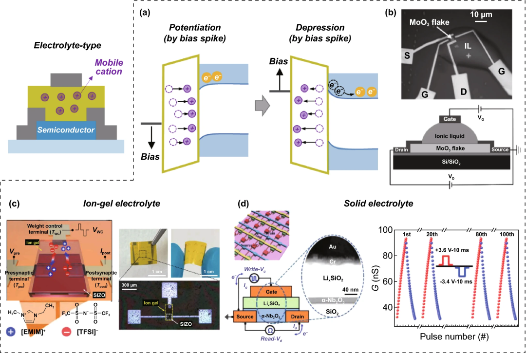 通过溶液工艺,将移动阳离子掺入绝缘基质中合成电解质,并将此具有高电容的电解质引入电介质区域,制造电解质晶体管型ES。通常使用半径小的移动阳离子,例如,质子,碱金属和碱土金属离子(Ca²⁺和Mg²⁺)。根据基质相,电解质可分为液体、凝胶和固体电解质。正偏置输入施加到栅极端时,电解质中的移动阳离子开始漂移到电解质/通道界面(图4a)。移动阳离子积聚在电解质/通道界面附近,分布不均匀并产生浓度梯度。在n型通道晶体管中,随着电子双层的形成和电化学掺杂反应,顺序累积的金属阳离子产生兴奋性变化,由于移动阳离子的浓度梯度消散需要一定的时间,即使不再施加偏置,更新的传导状态也会保持很长时间。当施加相反的偏置输入时,积累的移动阳离子则逐渐恢复到原始的均匀状态。由此可知,抑制电导开关可以通过在栅极端施加极性相反的编程偏置尖峰来实现。