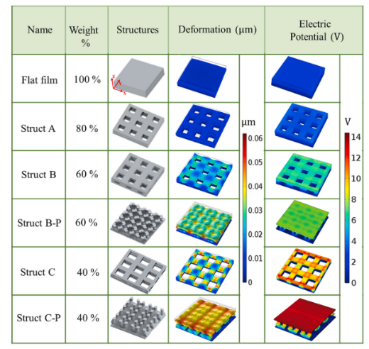课题组研究人员的前期研究工作表明,微结构化能显著提升压电器件的输出信号(Small 13 (23), 1604245;Nano Energy 60, 701等)。因此为了实现器件电信号输出的最大化,本文采用结构拓扑优化的方法优化压电膜的微观结构,并利用高精度面投影微立体光刻3D打印的微尺度加工能力,实现拓扑微结构的制造。数值模拟结果表明,微结构的引入能显著提高压电输出,并且具有优化微结构(struct B-P 和struct C-P)的压电薄膜能进一步提高信号输出(见图3)。