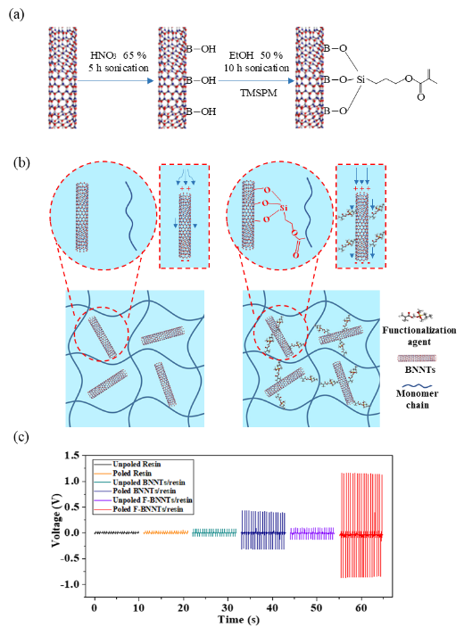 a)BNNTs表面功能化工艺;(b)原始BNNTs/功能化BNNTs和树脂基体界面力学行为示意图;(c)极化与未极化BNNTs等压电输出信号
