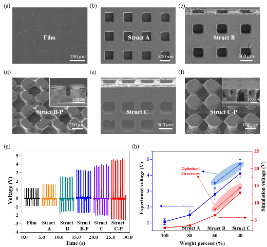 图4 (a-f)不同微结构压电薄膜;(g)薄膜压电输出;(h)压电微结构薄膜的压电输出实验与仿真对比