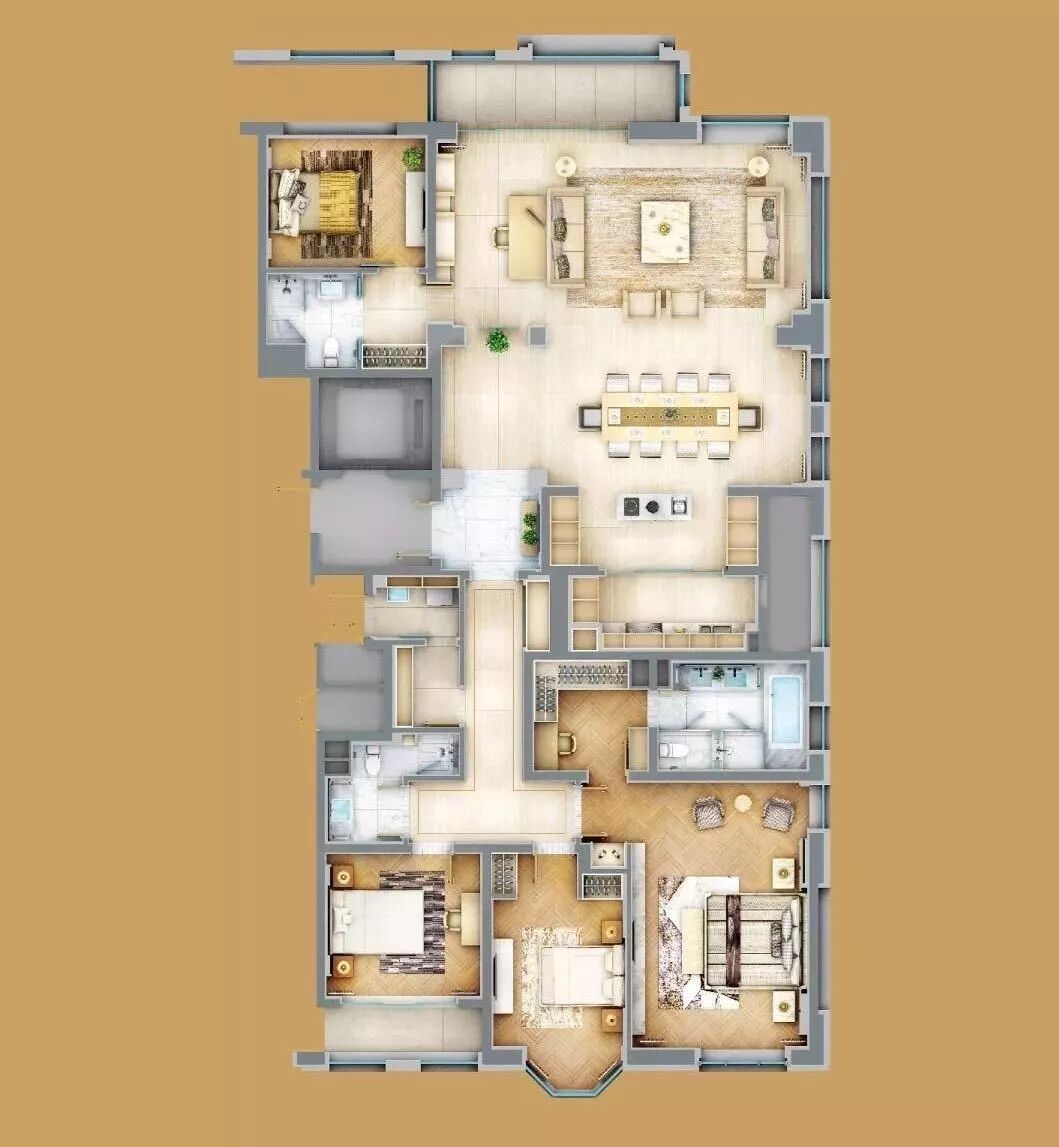 四个卧室毫无设计感,像小孩子堆积木一样的摆在那了。走廊狭长、门对门、面积浪费、窗子太小等问题一应俱全。在客厅看完电视回房间,看到长长的走廊左手右手两边都是房间,会不会感到是在住宾馆?