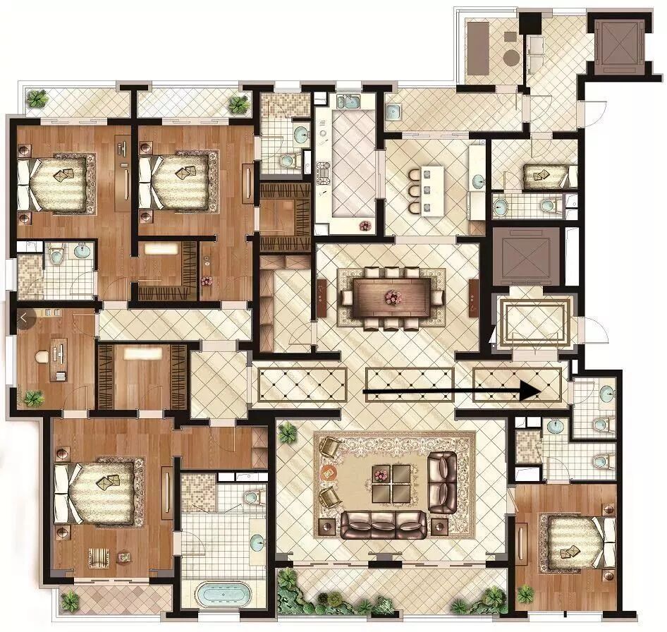 走廊正对卫生间这样的硬伤,200多平的面积其实很容易规避开。
