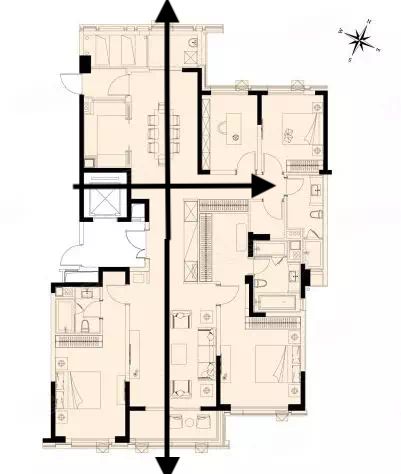 右上角次卧设计成之字形,最起码浪费了30%的面积。左上角次卧狭长,高端住宅硬是建成了酒店式公寓。