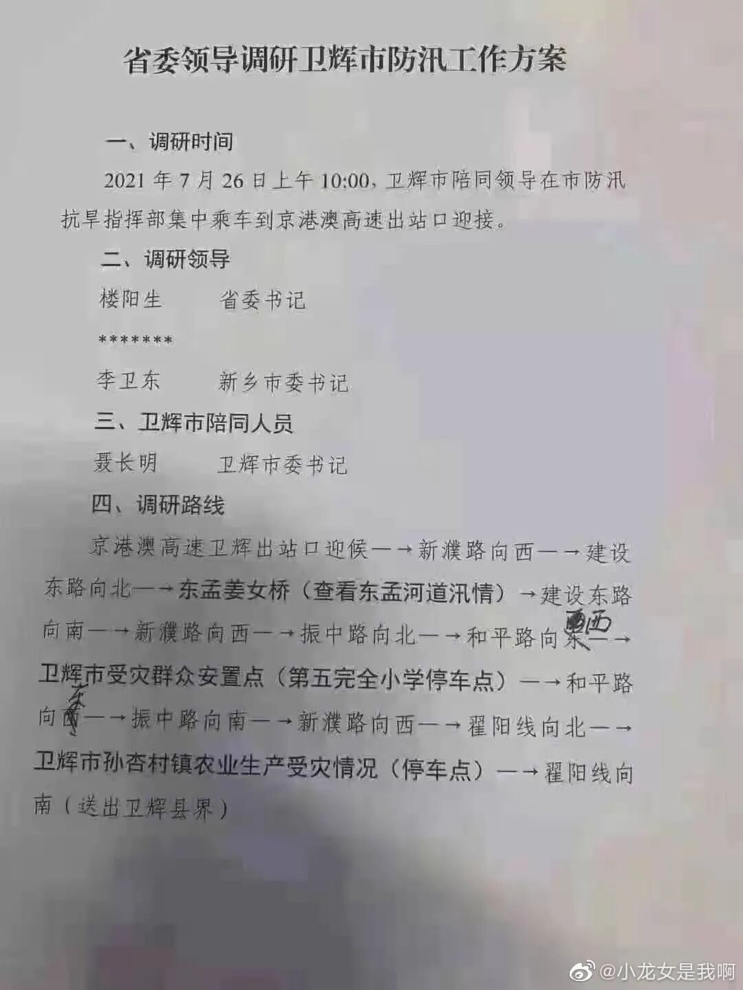 不知道。但或许与此相关的是,在7月26日上午10点,河南省委书记楼阳生的确去到卫辉“检查指导防汛救灾工作”,他及随行的书记们,先去了东孟姜女桥,又去了第五完全小学,最后去了孙杏村。