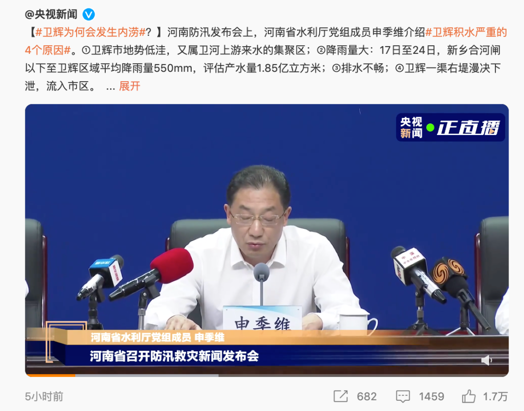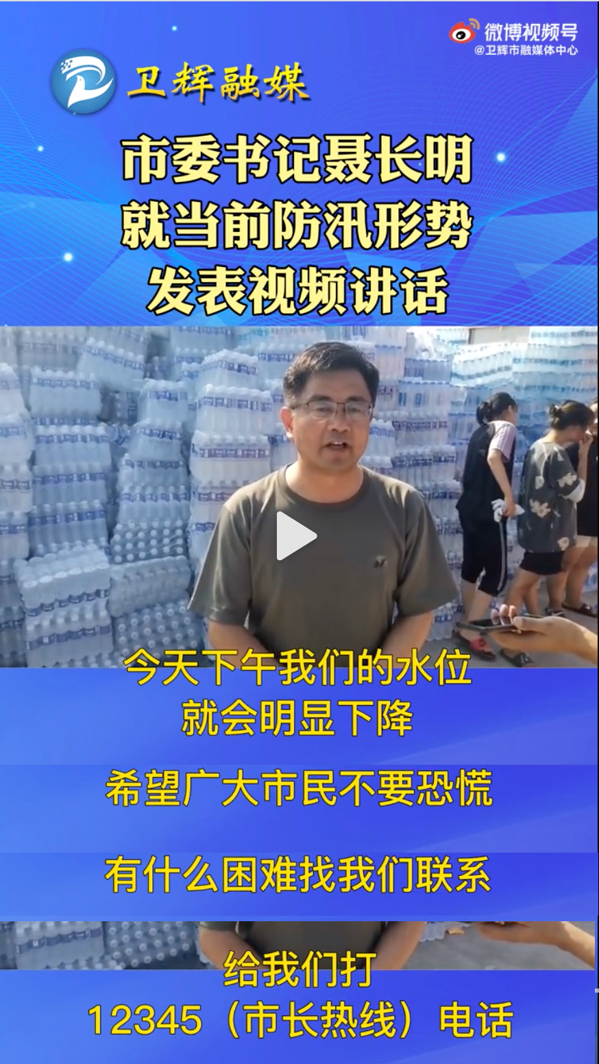然而发声内容并不关于龙吸水工作进展,也不是关于水位增高地区市民撤离的预警,而是一条来自卫辉市委书记聂长明《就当前防汛形势所做的视频讲话》。