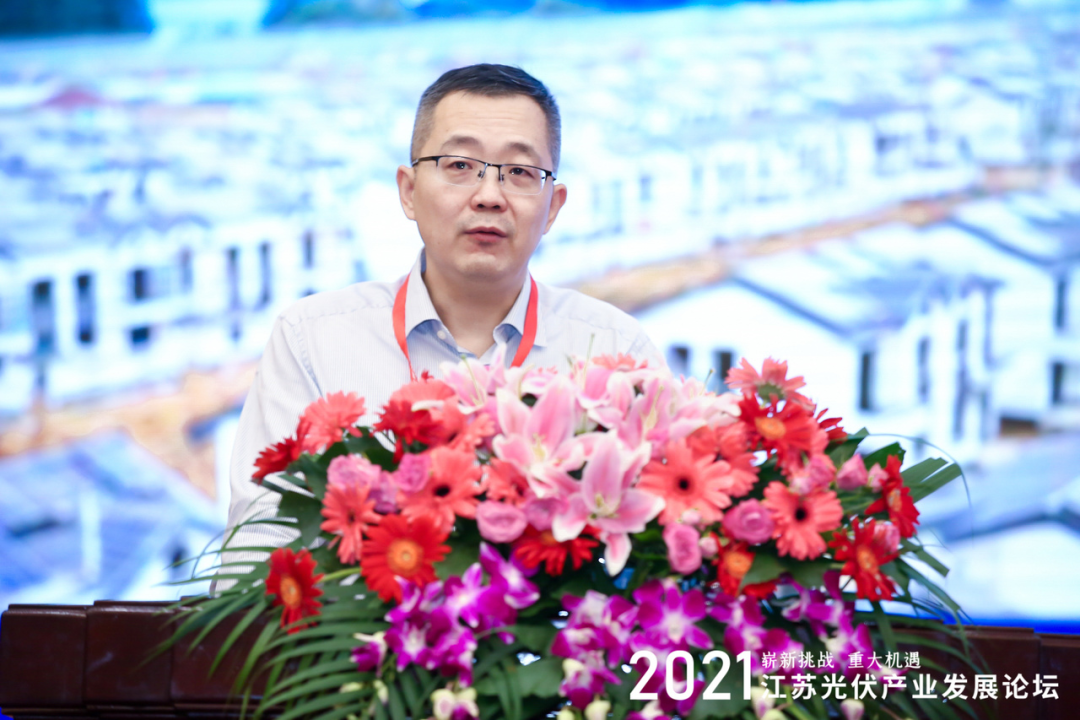 江苏省工信厅电子信息处处长李剑澄在致辞中介绍了全省光伏产业发展的概况,他介绍道:光伏产业是市场空间巨大的绿色能源产业,也是江苏省重点发展的战略新兴产业。光伏产业被列入省里重点推进的30条优势产业。全省光伏制造企业400家,进入工信部光伏制造规范条件的有63家,全省光伏从业人员有11万人,2020年,江苏全省多晶硅产量4.2万吨,在全国占比10%,硅片产量62GW,在全国占比38%,组件产能是61GW,在全国占比50%,江苏全省光伏产业发展速度非常快。