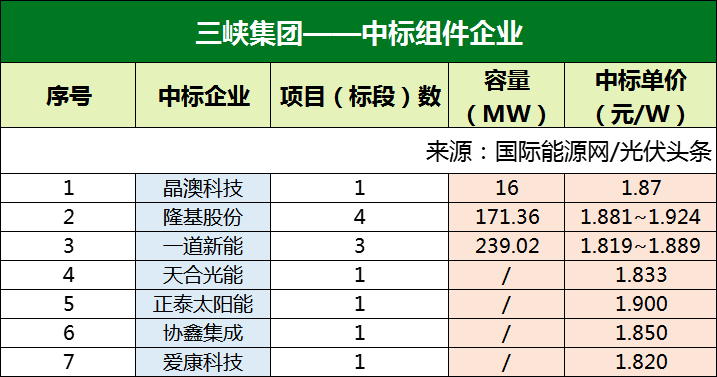 4月下旬以来,三峡集团有6个组件招标项目定标,隆基股份、晶澳科技、一道新能、天合光能、正泰太阳能、协鑫集成、爱康科技等7家企业中标,具体情况如下: