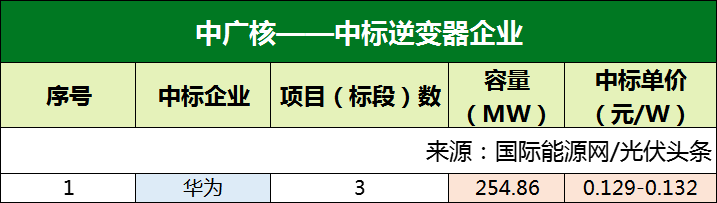 中广核3个项目定标,合计容量254.86MW,华为成为最大赢家,全揽中广核3个采购项目。