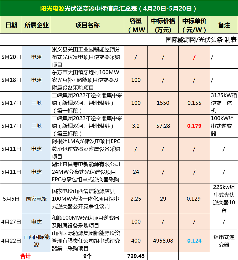 阳光电源尽管之前事务缠身,不过并不影响他们在招投标市场上的表现。4月下旬以来,阳光电源中标三峡集团、中国电建、国家电投、山西国际能源集团等企业9个项目,确定中标容量729.45MW。