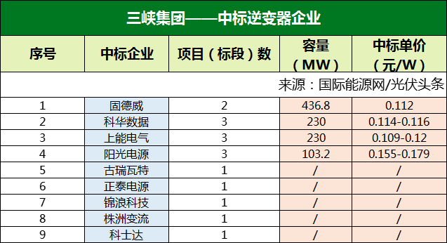 三峡集团有9个项目定标,包括一个800MW的集采项目,固德威、科华数据、上能电气、阳光电源、古瑞瓦特、正泰电源、锦浪科技、株洲变流、科士达等企业中标。正泰电源的250kW组串式和多款分布式逆变器分别入围中核汇能集中采购、三峡集团的年度采购。