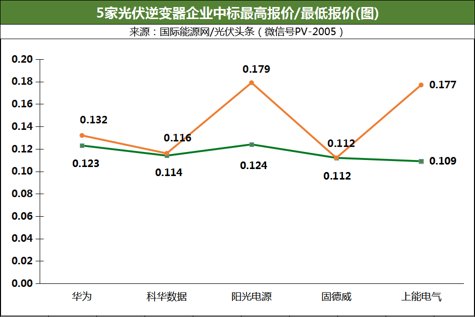 阳光电源最低价中标项目为,山西国际能源集团新能源投资管理有限责任公司组串式逆变器集中采购项目,该项目招标容量400MW,阳光电源投标报价4958.08万元,折合单价0.124元/W。