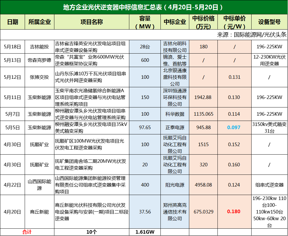 4月下旬以来,吉林能投、山西国际能源集团、玉柴新能源、抚顺矿业等地方国企10个项目定标,合计容量1.61GW。