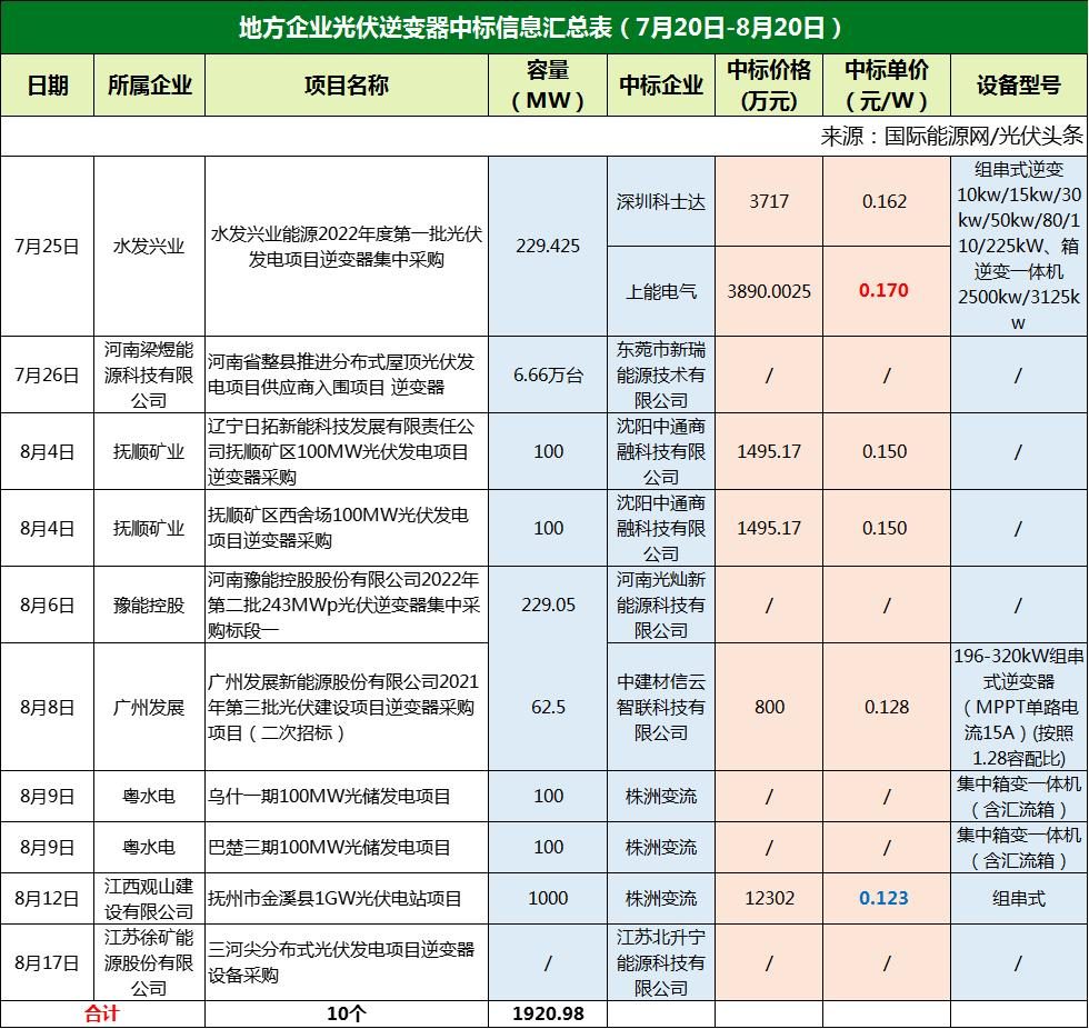 国际能源网/光伏头条(PV-2005)根据公开信息不完全统计,7月20日-8月20日,约有39个逆变器招标项目定标,合计容量10.39GW。中标企业方面,株洲变流、阳光电源、首航新能源、科华数据、上能电气排名中标容量榜前五,华为、特变电工、锦浪科技、科士达、正泰电源、科华数据等企业也有亮眼的表现。